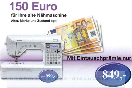 Sie bestellen Ihre neue Brother Innov-is 350 in unserem Fachgeschäft. Wenn Sie uns dann Ihre alte Nähmaschine (Marke, Zustand und Alter egal) überreichen, bekommen Sie die Brother Innov- is 350 anstatt für 999,00 EUR (Preisempfehlung des Herstellers) für nur 849,00 EUR.