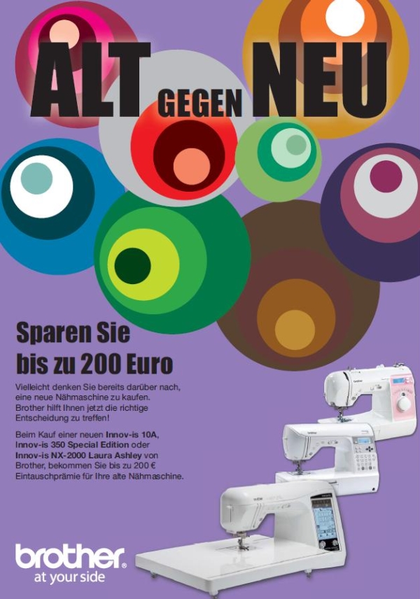 Beim Kauf einer neuen Innov-is 350 von Brother bekommen Sie 150 EUR Eintauschprämie für Ihre alte Nähmaschine (Marke, Zustand und Alter egal) !