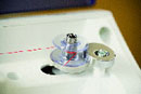 Volle Spule einlegen, Faden in Pfeilrichtung in die Führung legen und schon sind Sie startbereit.